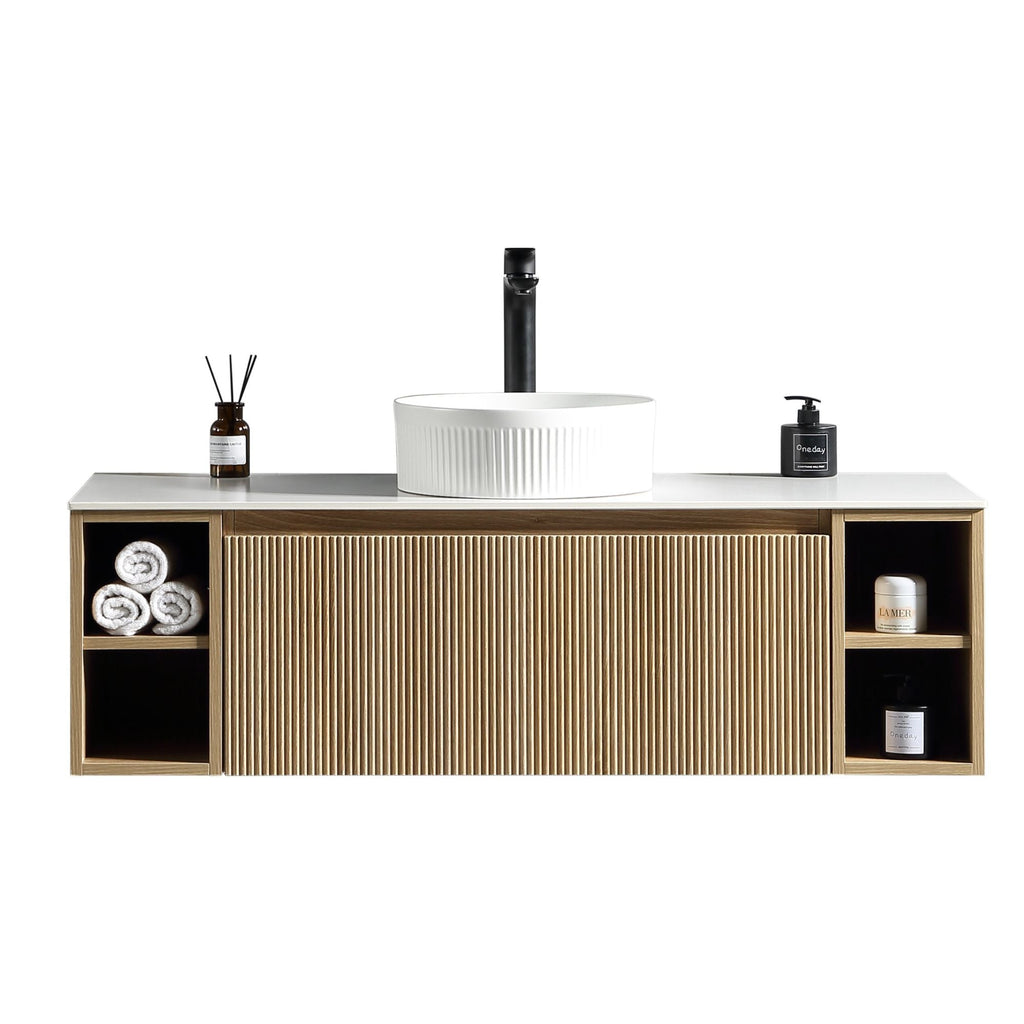 Florence Fluted Wall Mounted Vanity Unit With Worktop and Open Shelf - Country Oak