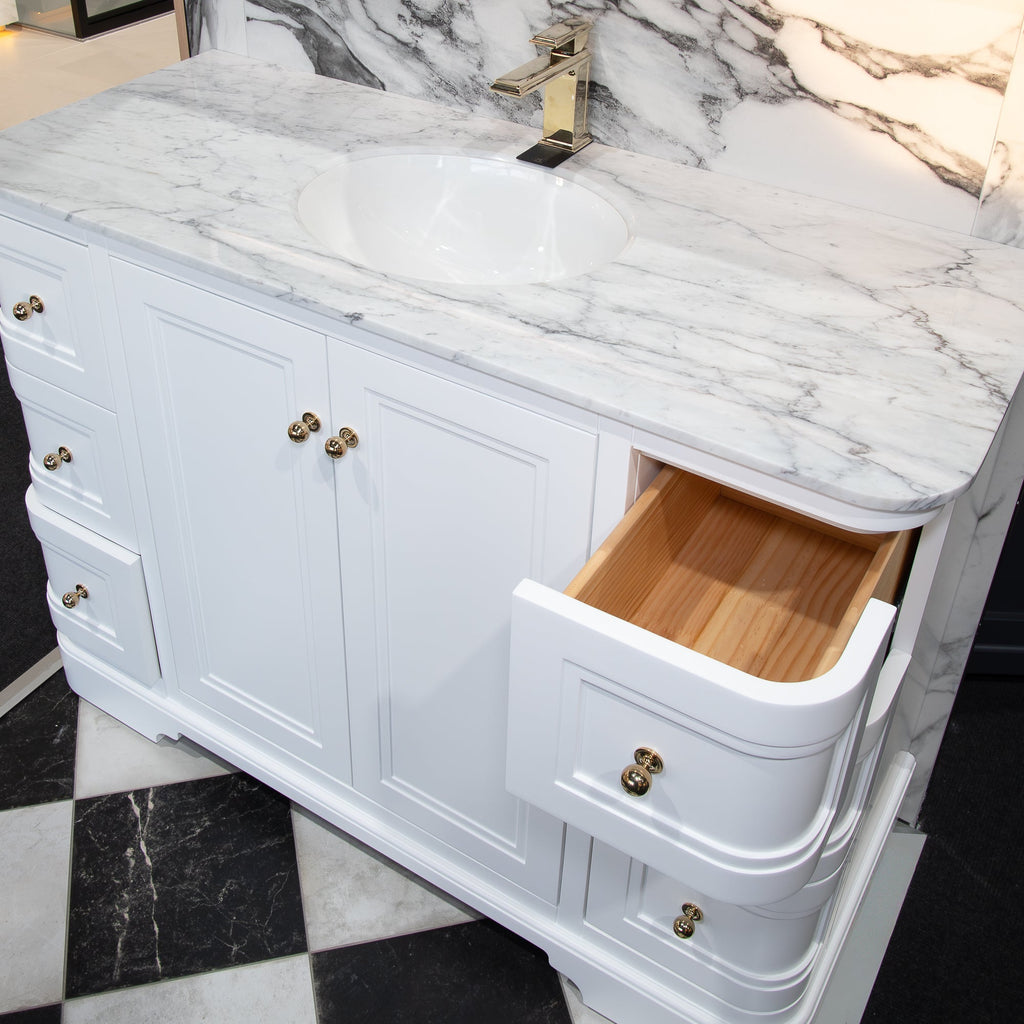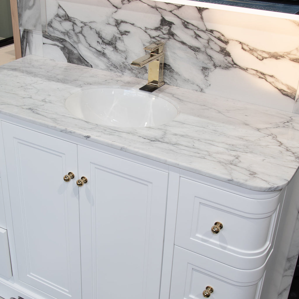 The vanity is crowned with a premium worktop, available in elegant Carrara Marble or Pure White Quartz, perfectly paired with a seamlessly integrated oval inset basin. This refined combination creates a striking focal point while maintaining a clean, harmonious aesthetic.