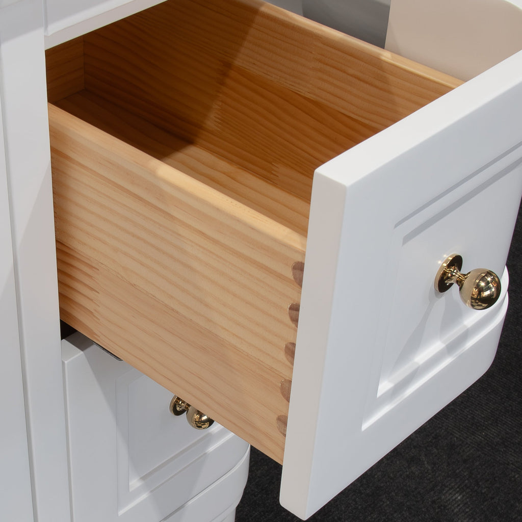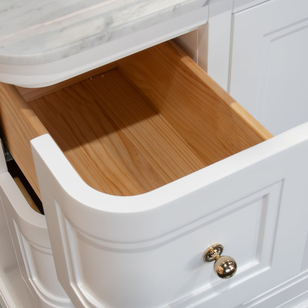 Expertly crafted, the New Hampton vanity offers generous storage with six beautifully constructed dovetailed drawers and a central double-door cupboard, all featuring smooth soft-close mechanisms for effortless use. Each drawer and door is adorned with exquisite gold-effect knob handles, adding a subtle touch of opulence to the design.